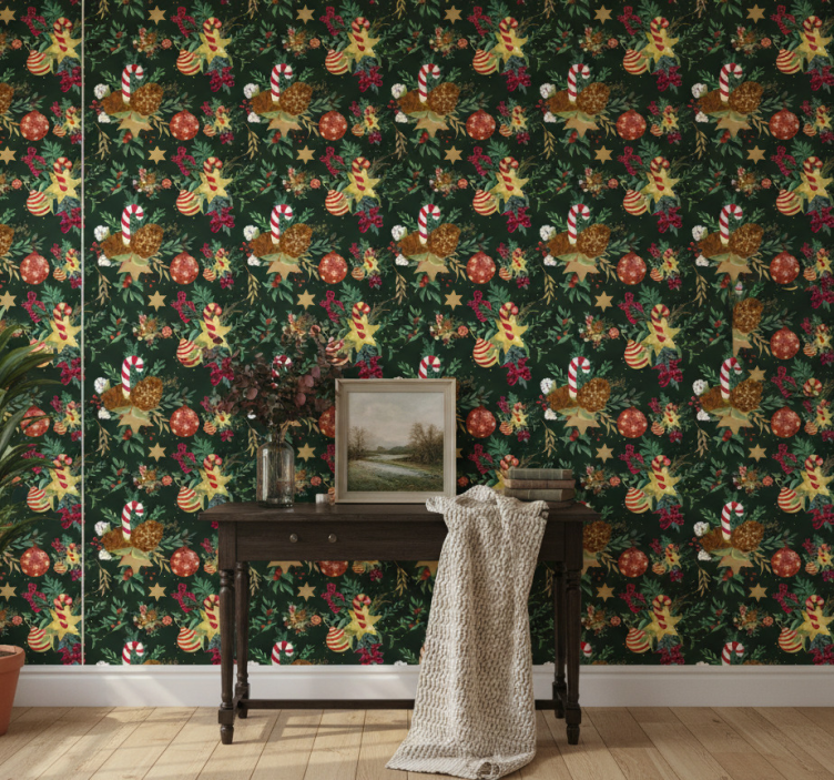 一个充满活力的图案,包含松果、饰品、糖果棒和花卉图案。这些元素装饰着星星和各种复杂的细节,唤起温暖的节日气氛。每个组件在深绿色的背景下舞动,创造出丰富的节日意象的挂毯。